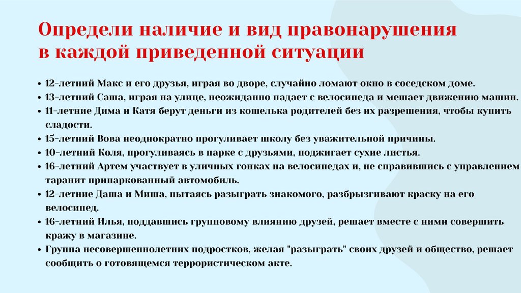 Определи наличие и вид правонарушенияв каждой приведенной ситуации
