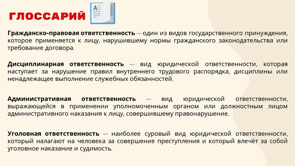 ГлоссарийГражданско-правовая ответственность — один из видов государственного принуждения,