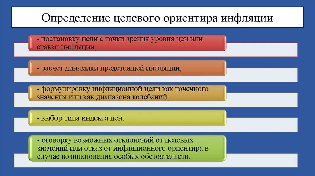Определение целевого ориентира инфляции- постановку цели с точки зрения уровня цен или