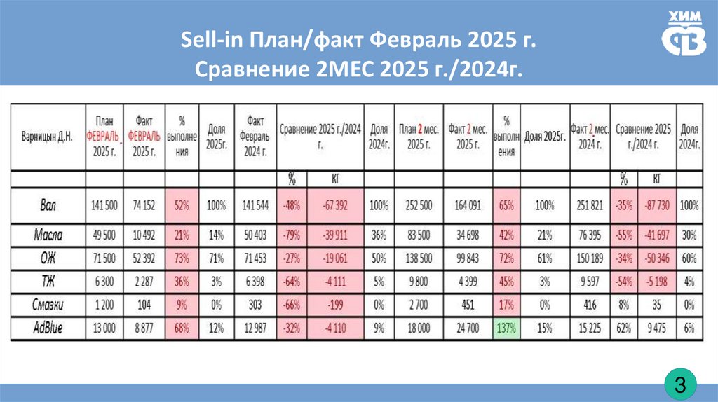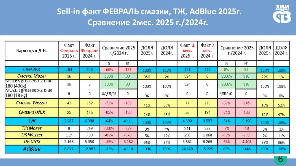 Sell-in факт ФЕВРАЛЬ смазки, ТЖ, AdBlue 2025г.Сравнение 2мес. 2025 г./2024г.