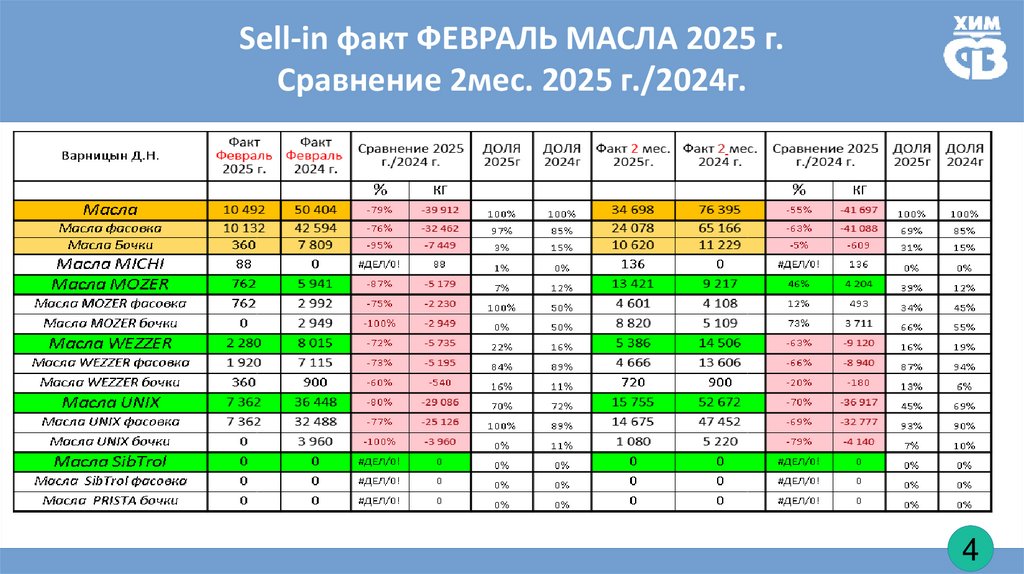 Sell-in факт ФЕВРАЛЬ МАСЛА 2025 г.Сравнение 2мес. 2025 г./2024г.