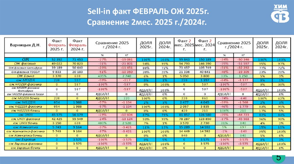 Sell-in факт ФЕВРАЛЬ ОЖ 2025г.Сравнение 2мес. 2025 г./2024г.