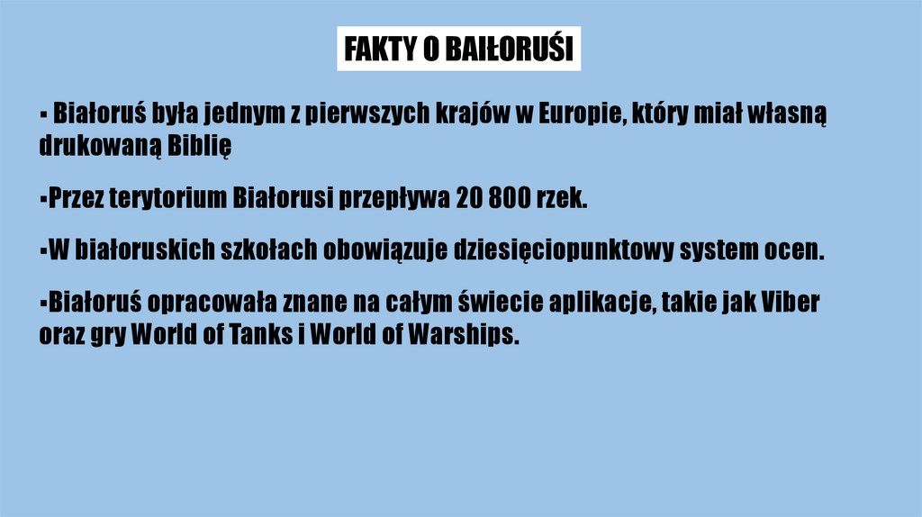 FAKTY O BAIŁORUŚI▪ Białoruś była jednym z pierwszych krajów w Europie, który miał własną