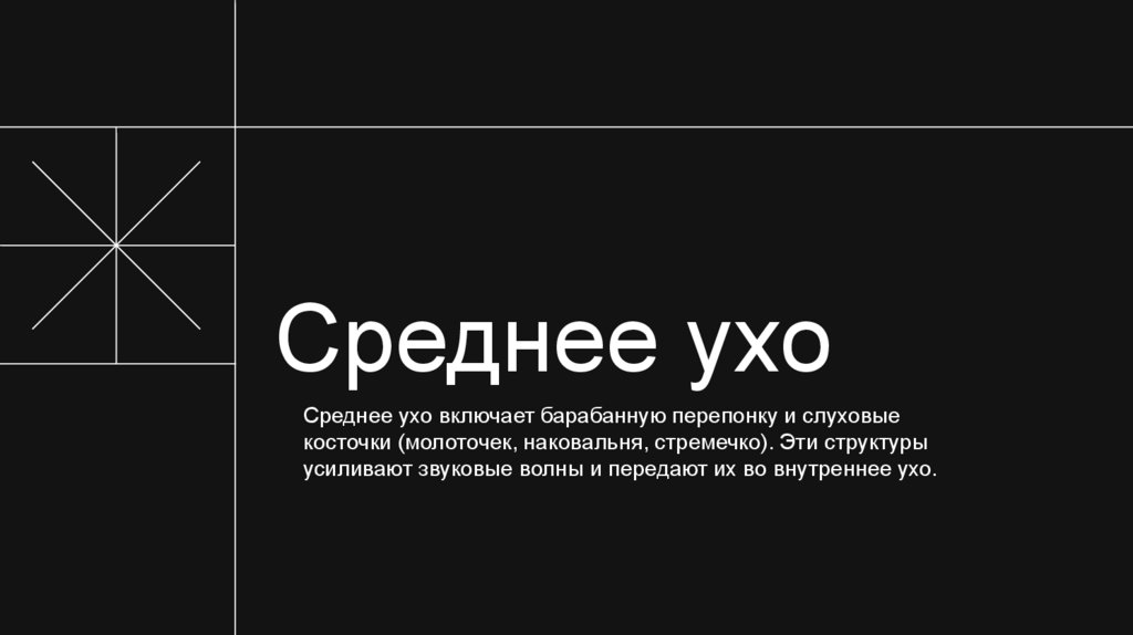 Среднее ухоСреднее ухо включает барабанную перепонку и слуховые