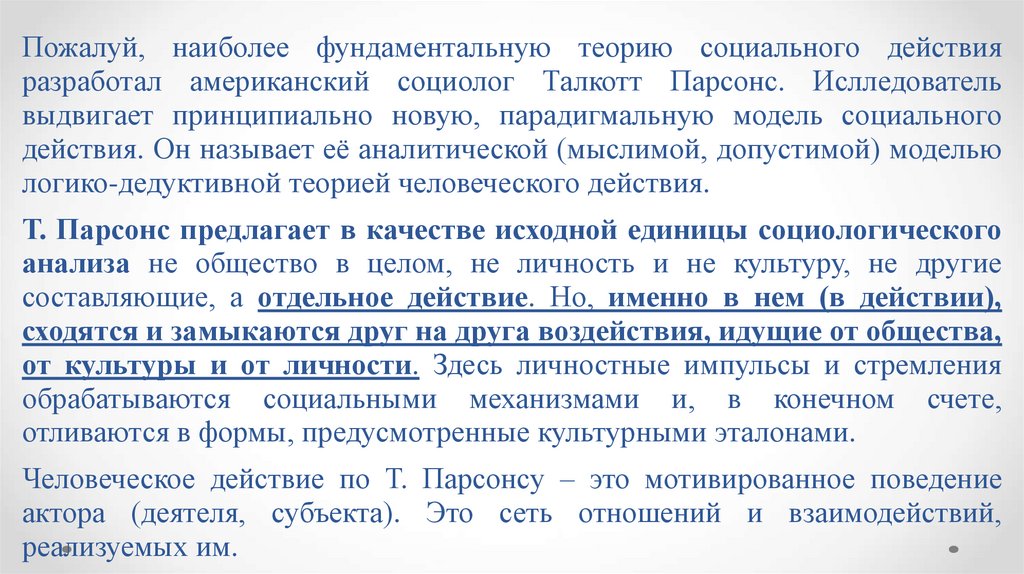 Пожалуй, наиболее фундаментальную теорию социального действияразработал американский социолог Талкотт Парсонс. Ислледователь