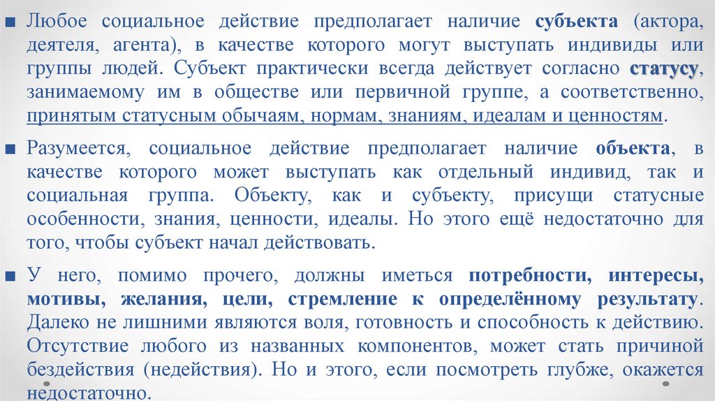 ■ Любое социальное действие предполагает наличие субъекта (актора,деятеля, агента), в качестве которого могут выступать индивиды или