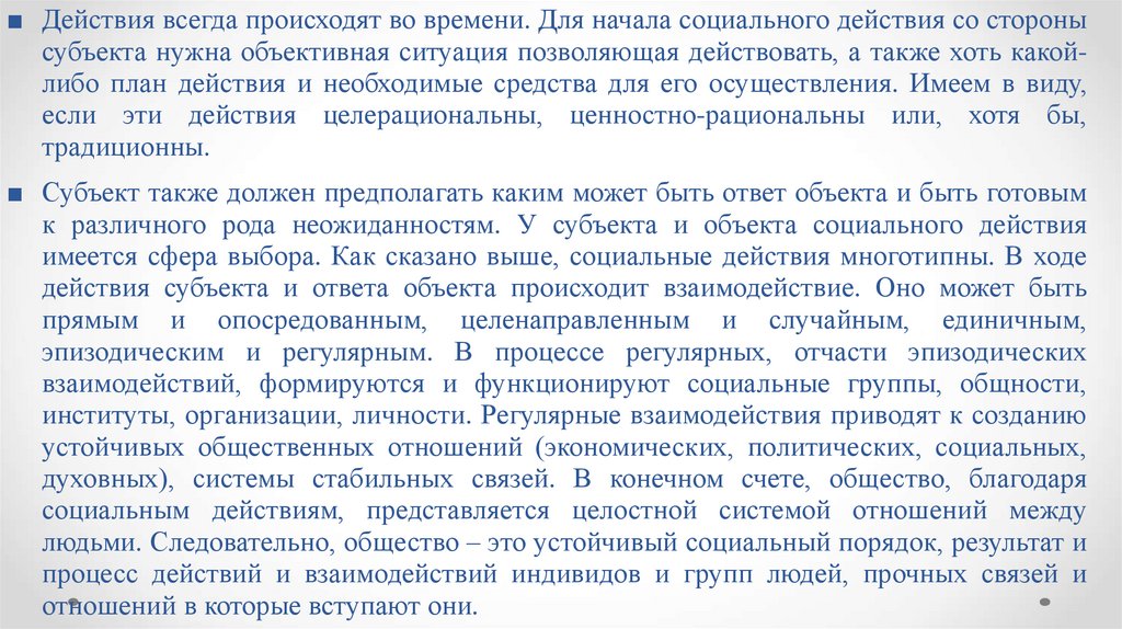 ■ Действия всегда происходят во времени. Для начала социального действия со сторонысубъекта нужна объективная ситуация позволяющая действовать, а также хоть какойлибо план действия и необходимые средства для его осуществления. Имеем в виду,