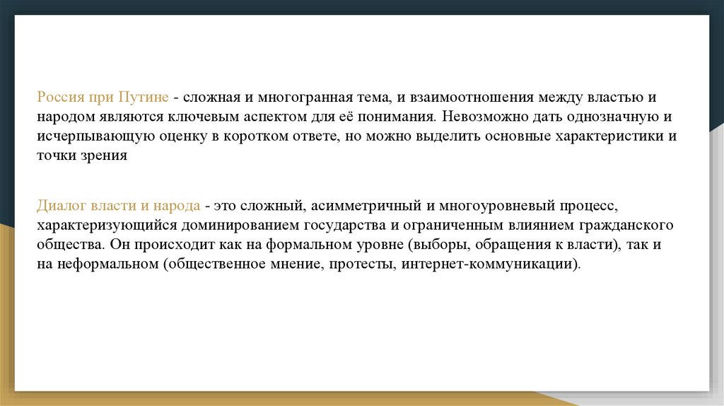 Россия при Путине - сложная и многогранная тема, и взаимоотношения между властью инародом являются ключевым аспектом для её понимания. Невозможно дать однозначную и