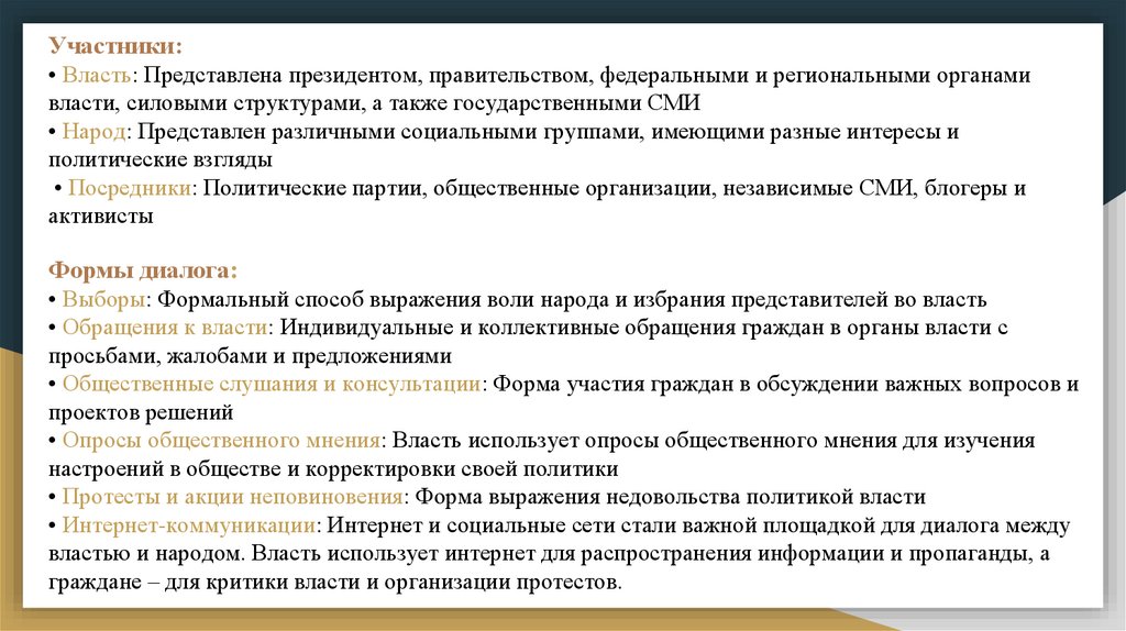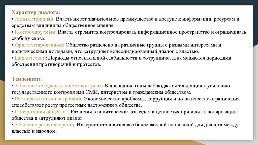 Характер диалога:• Асимметричный: Власть имеет значительное преимущество в доступе к информации, ресурсам и