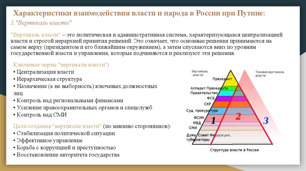 Характеристики взаимодействия власти и народа в России при Путине:1."Вертикаль власти"