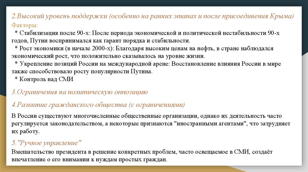 2.Высокий уровень поддержки (особенно на ранних этапах и после присоединения Крыма)Факторы: