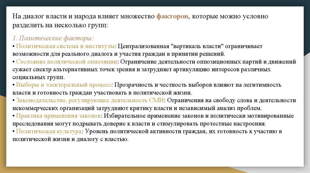 На диалог власти и народа влияет множество факторов, которые можно условноразделить на несколько групп: