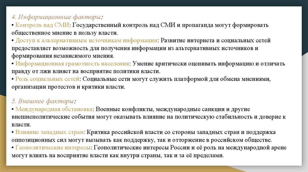 4. Информационные факторы:• Контроль над СМИ: Государственный контроль над СМИ и пропаганда могут формировать