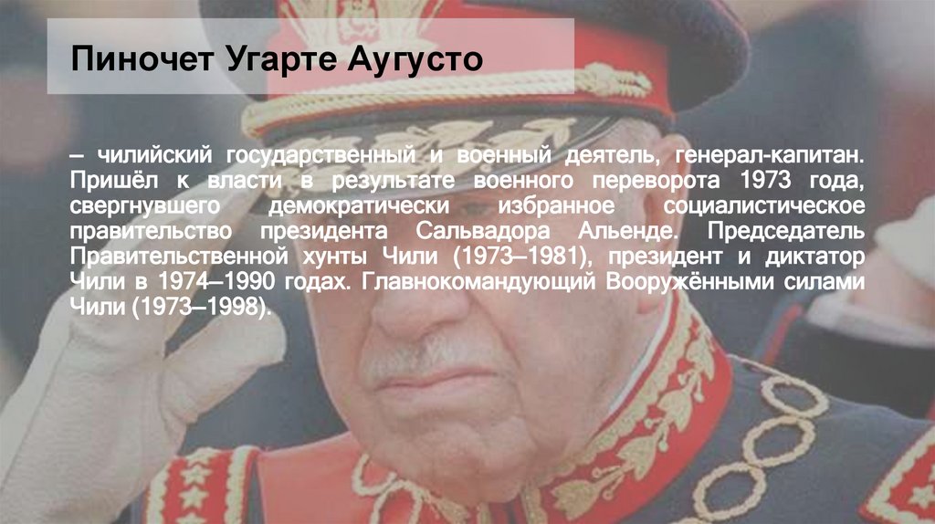 Пиночет Угарте Аугусто— чилийский государственный и военный деятель, генерал-капитан.