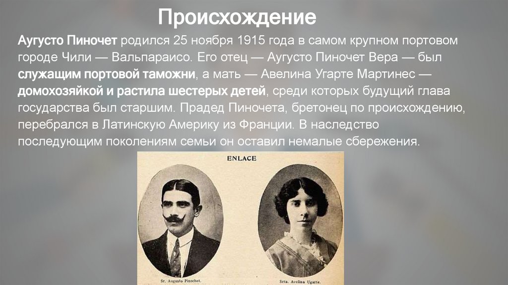 ПроисхождениеАугусто Пиночет родился 25 ноября 1915 года в самом крупном портовом