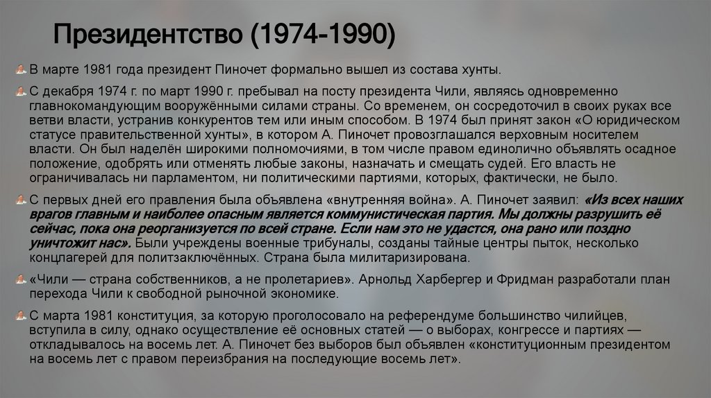 Президентство (1974-1990)В марте 1981 года президент Пиночет формально вышел из состава хунты.