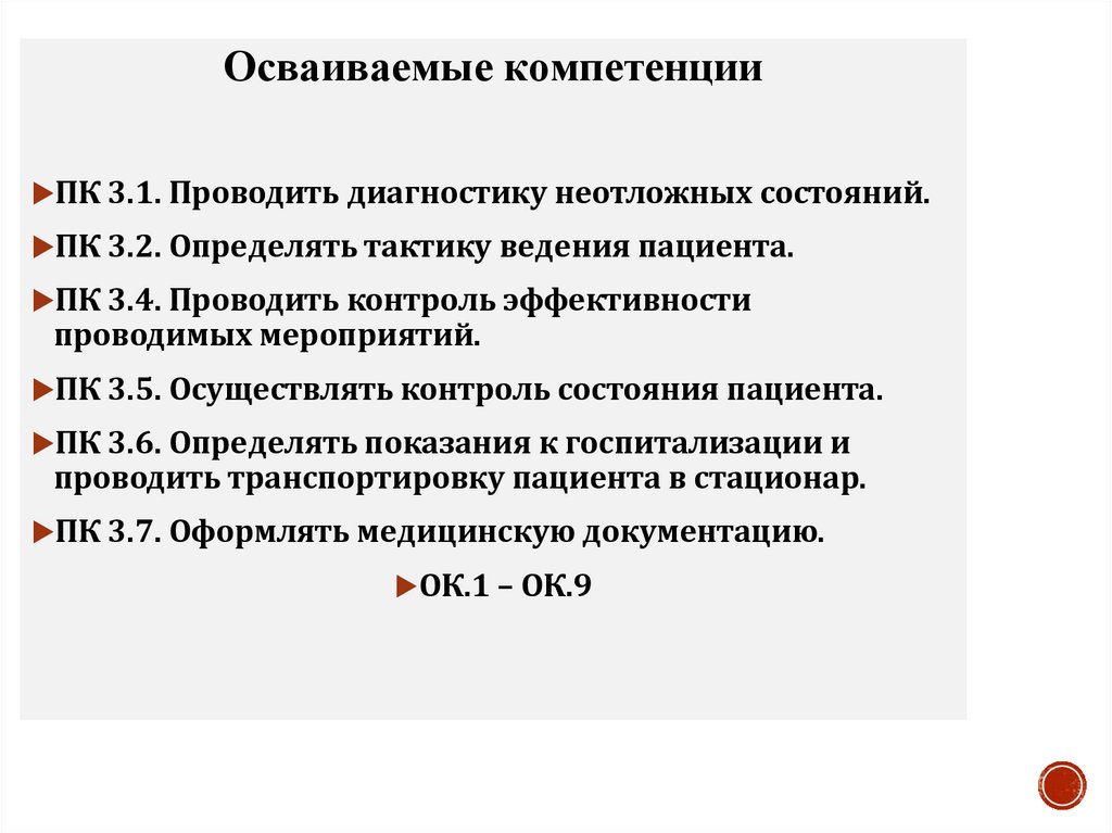 Осваиваемые компетенцииПК 3.1. Проводить диагностику неотложных состояний.