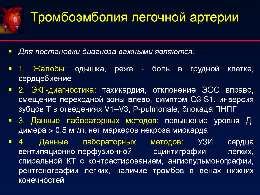 Тромбоэмболия легочной артерииДля постановки диагноза важными являются: