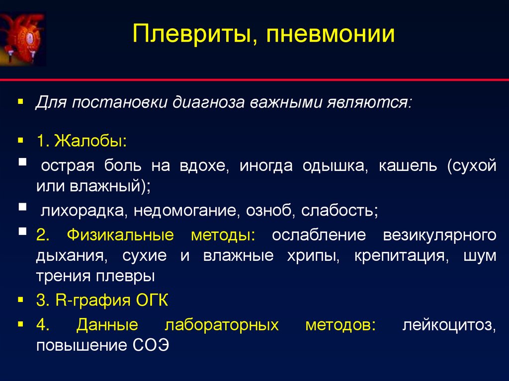 Плевриты, пневмонииДля постановки диагноза важными являются: