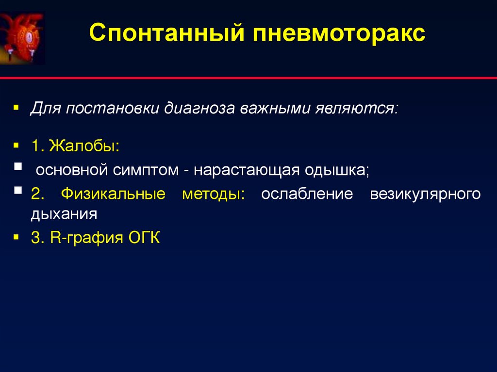 Спонтанный пневмотораксДля постановки диагноза важными являются: