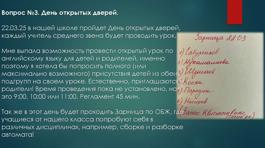Вопрос №3. День открытых дверей.22.03.25 в нашей школе пройдет День открытых дверей,