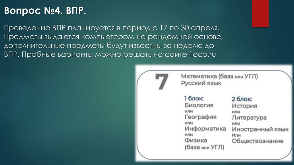 Вопрос №4. ВПР.Проведение ВПР планируется в период с 17 по 30 апреля.