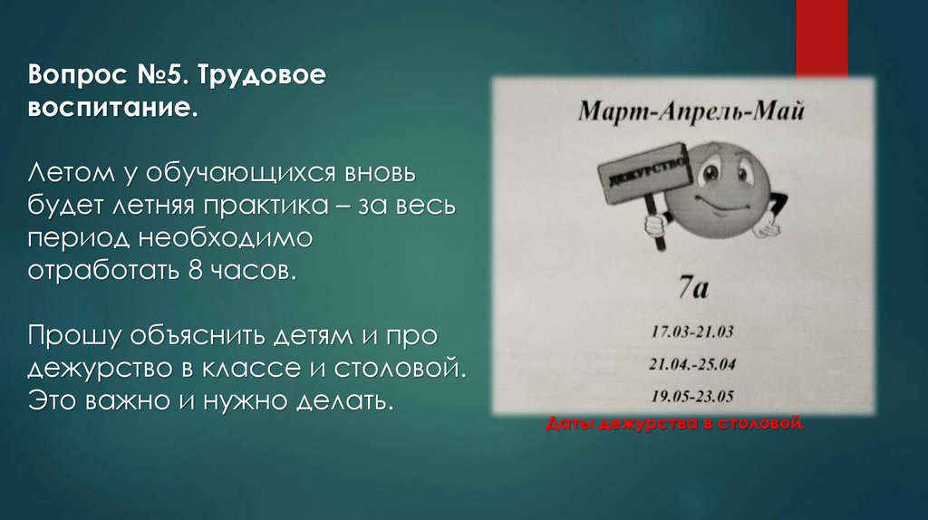 Даты дежурства в столовой.