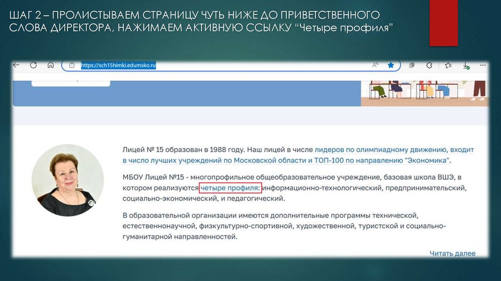 ШАГ 2 – ПРОЛИСТЫВАЕМ СТРАНИЦУ ЧУТЬ НИЖЕ ДО ПРИВЕТСТВЕННОГОСЛОВА ДИРЕКТОРА, НАЖИМАЕМ АКТИВНУЮ ССЫЛКУ “Четыре профиля”