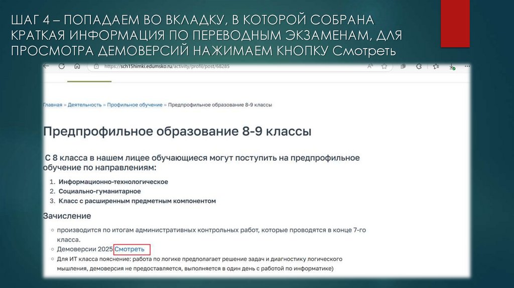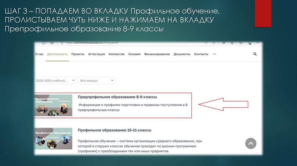 ШАГ 3 – ПОПАДАЕМ ВО ВКЛАДКУ Профильное обучение,ПРОЛИСТЫВАЕМ ЧУТЬ НИЖЕ И НАЖИМАЕМ НА ВКЛАДКУ
