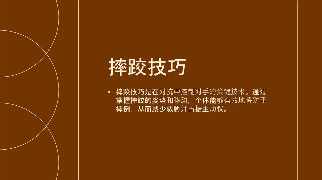 摔跤技巧• 摔跤技巧是在对抗中控制对手的关键技术。通过