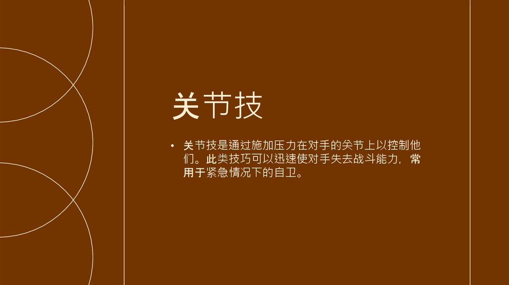 关节技• 关节技是通过施加压力在对手的关节上以控制他