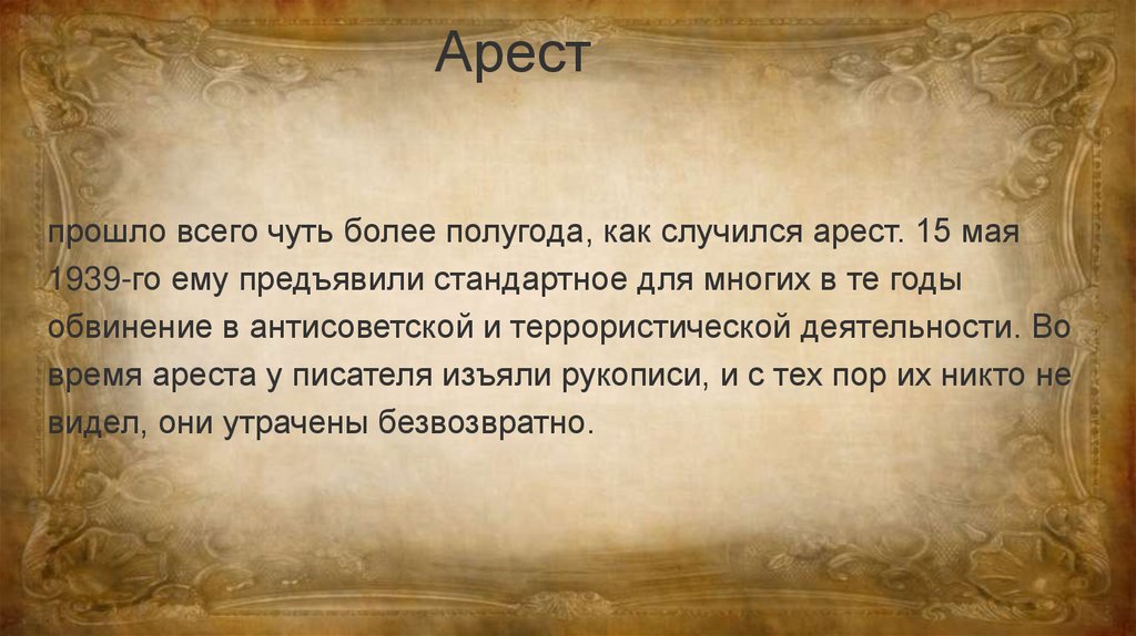 время ареста у писателя изъяли рукописи, и с тех пор их никто не