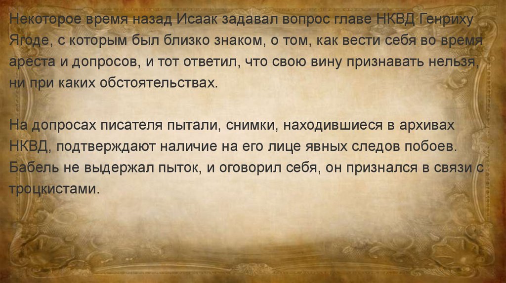 Некоторое время назад Исаак задавал вопрос главе НКВД ГенрихуЯгоде, с которым был близко знаком, о том, как вести себя во время