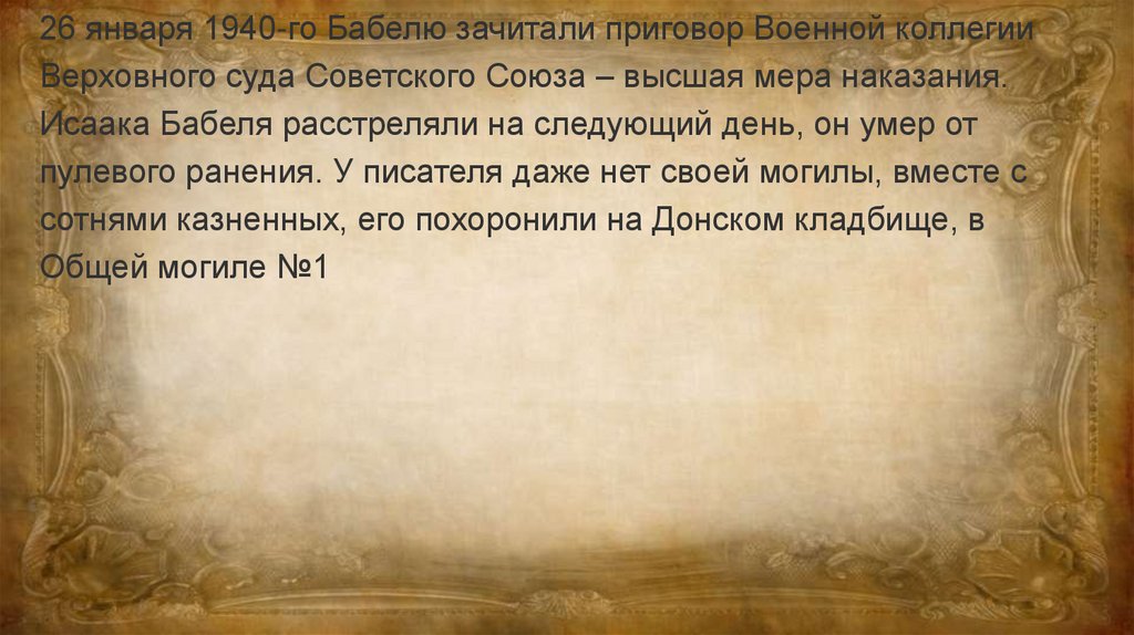 26 января 1940-го Бабелю зачитали приговор Военной коллегииВерховного суда Советского Союза – высшая мера наказания.