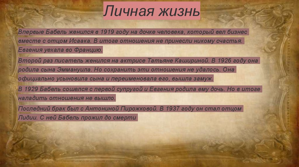 Личная жизньВпервые Бабель женился в 1919 году на дочке человека, который вел бизнес