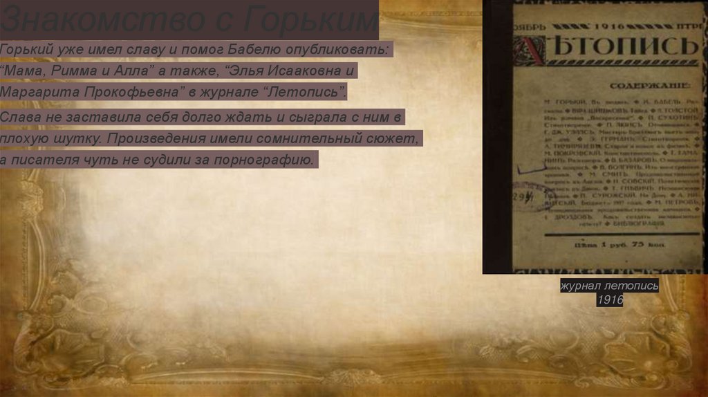 Знакомство с ГорькимГорький уже имел славу и помог Бабелю опубликовать: