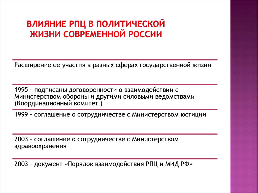 Расширение ее участия в разных сферах государственной жизни1995 – подписаны договоренности о взаимодействии с