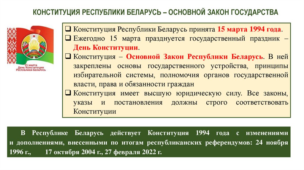 КОНСТИТУЦИЯ РЕСПУБЛИКИ БЕЛАРУСЬ – ОСНОВНОЙ ЗАКОН ГОСУДАРСТВАКонституция Республики Беларусь принята 15 марта 1994 года.