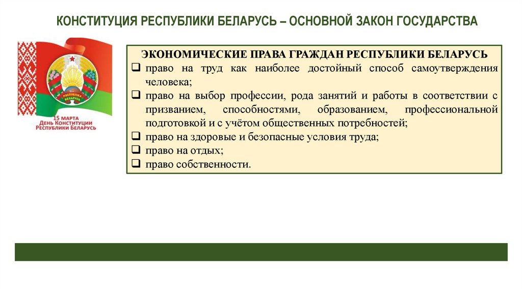 КОНСТИТУЦИЯ РЕСПУБЛИКИ БЕЛАРУСЬ – ОСНОВНОЙ ЗАКОН ГОСУДАРСТВАЭКОНОМИЧЕСКИЕ ПРАВА ГРАЖДАН РЕСПУБЛИКИ БЕЛАРУСЬ