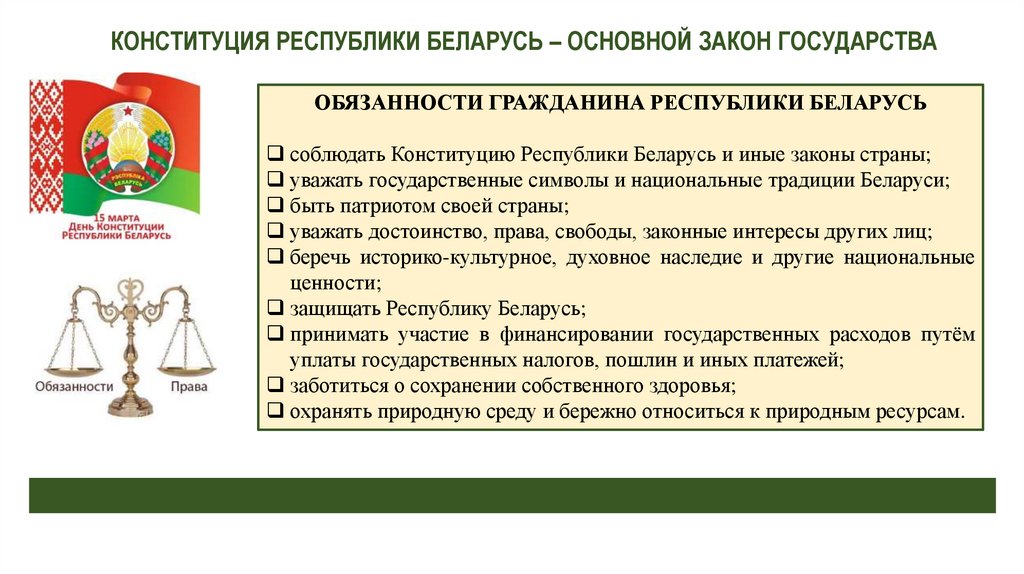 КОНСТИТУЦИЯ РЕСПУБЛИКИ БЕЛАРУСЬ – ОСНОВНОЙ ЗАКОН ГОСУДАРСТВАОБЯЗАННОСТИ ГРАЖДАНИНА РЕСПУБЛИКИ БЕЛАРУСЬ