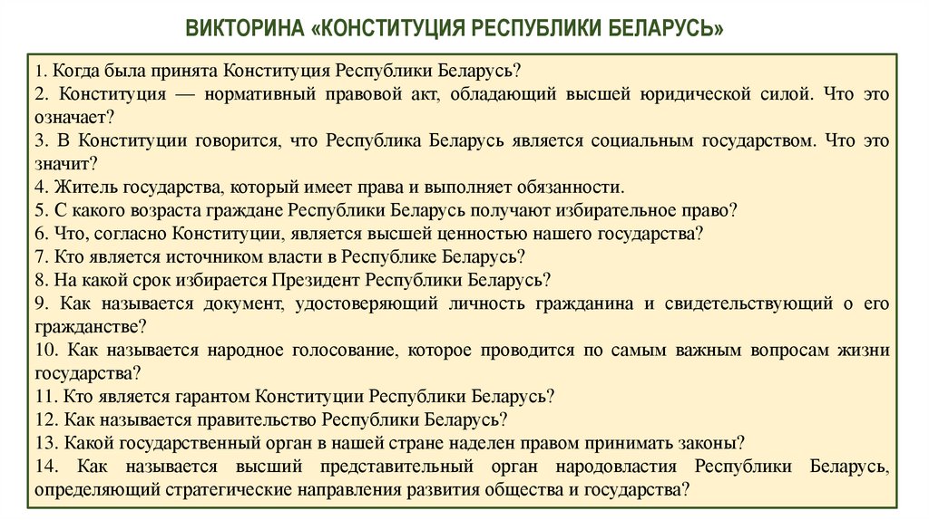 ВИКТОРИНА «КОНСТИТУЦИЯ РЕСПУБЛИКИ БЕЛАРУСЬ»1. Когда была принята Конституция Республики Беларусь?