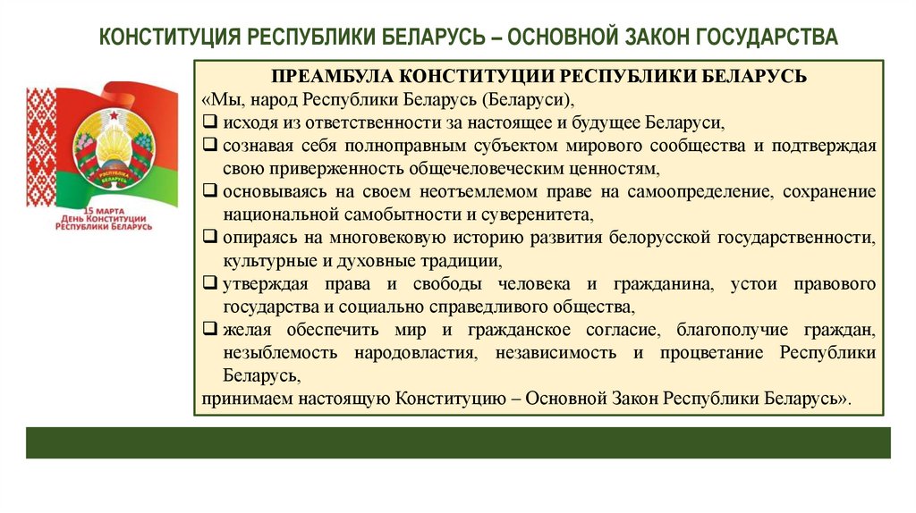 КОНСТИТУЦИЯ РЕСПУБЛИКИ БЕЛАРУСЬ – ОСНОВНОЙ ЗАКОН ГОСУДАРСТВАПРЕАМБУЛА КОНСТИТУЦИИ РЕСПУБЛИКИ БЕЛАРУСЬ