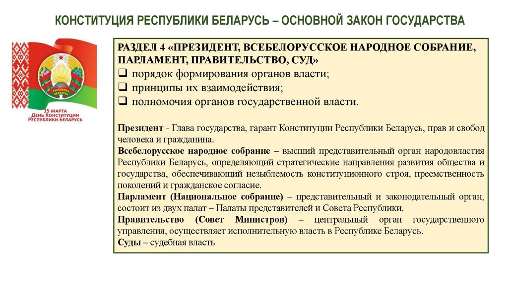 КОНСТИТУЦИЯ РЕСПУБЛИКИ БЕЛАРУСЬ – ОСНОВНОЙ ЗАКОН ГОСУДАРСТВАРАЗДЕЛ 4 «ПРЕЗИДЕНТ, ВСЕБЕЛОРУССКОЕ НАРОДНОЕ СОБРАНИЕ,