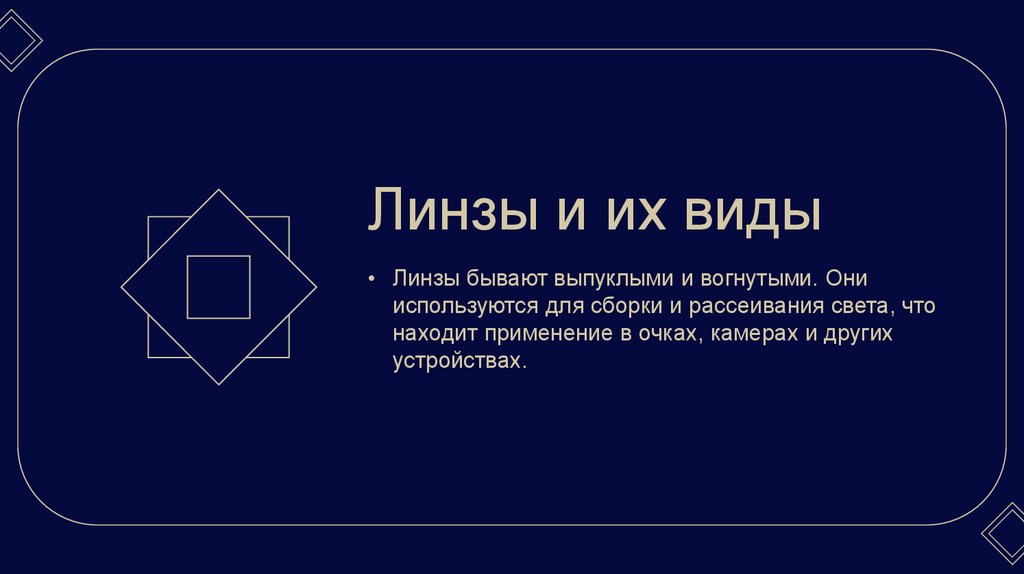 Линзы и их виды• Линзы бывают выпуклыми и вогнутыми. Они
