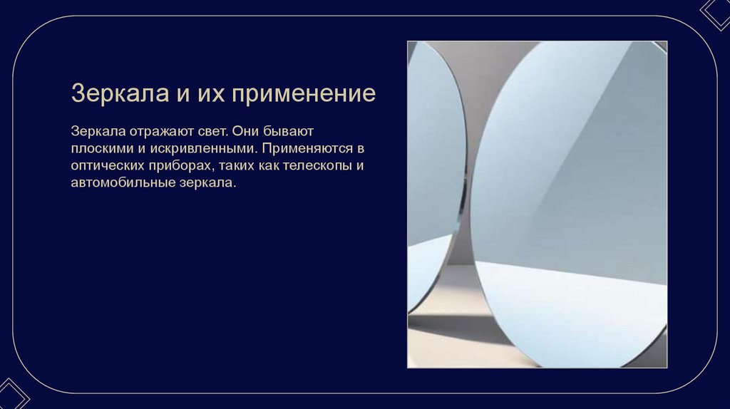 Зеркала и их применениеЗеркала отражают свет. Они бывают