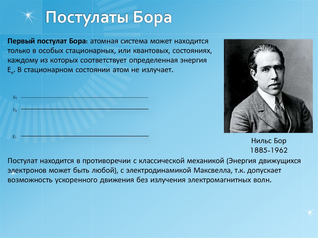 Первый постулат Бора: атомная система может находитсятолько в особых стационарных, или квантовых, состояниях,