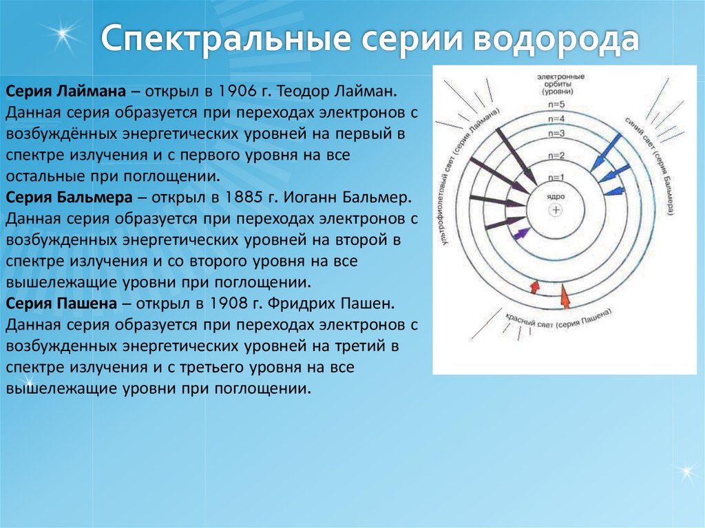 Серия Лаймана – открыл в 1906 г. Теодор Лайман.Данная серия образуется при переходах электронов с