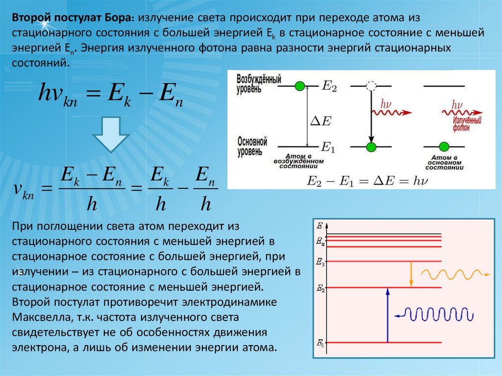 Второй постулат Бора: излучение света происходит при переходе атома изстационарного состояния с большей энергией Ek в стационарное состояние с меньшей