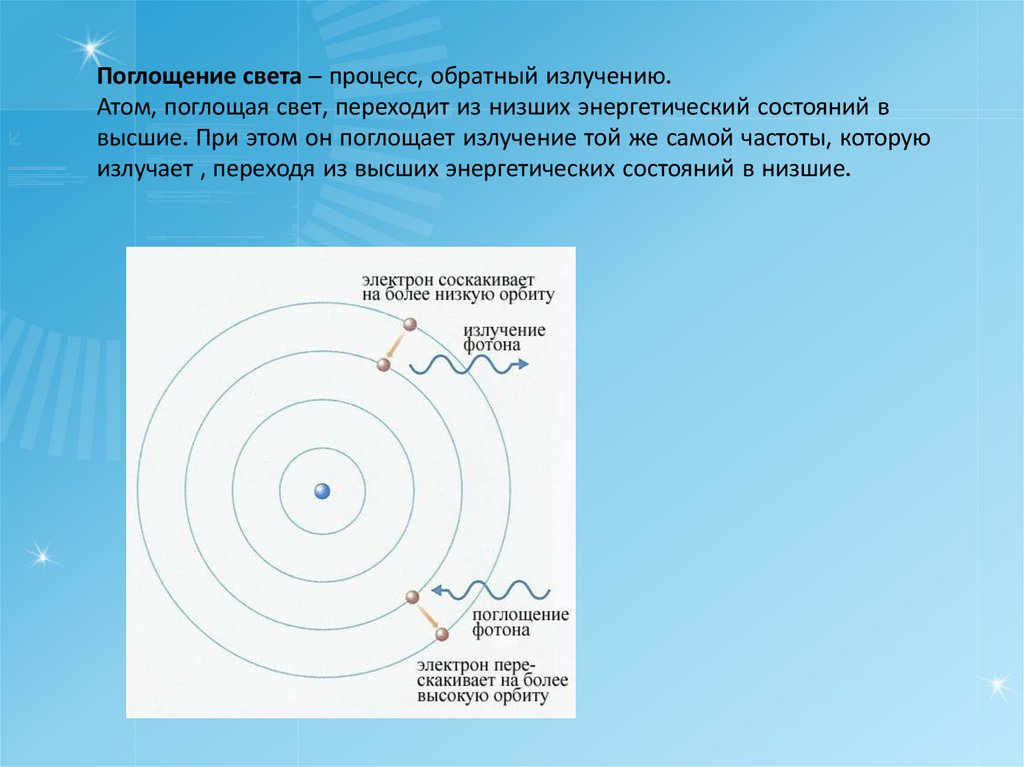 Поглощение света – процесс, обратный излучению.Атом, поглощая свет, переходит из низших энергетический состояний в
