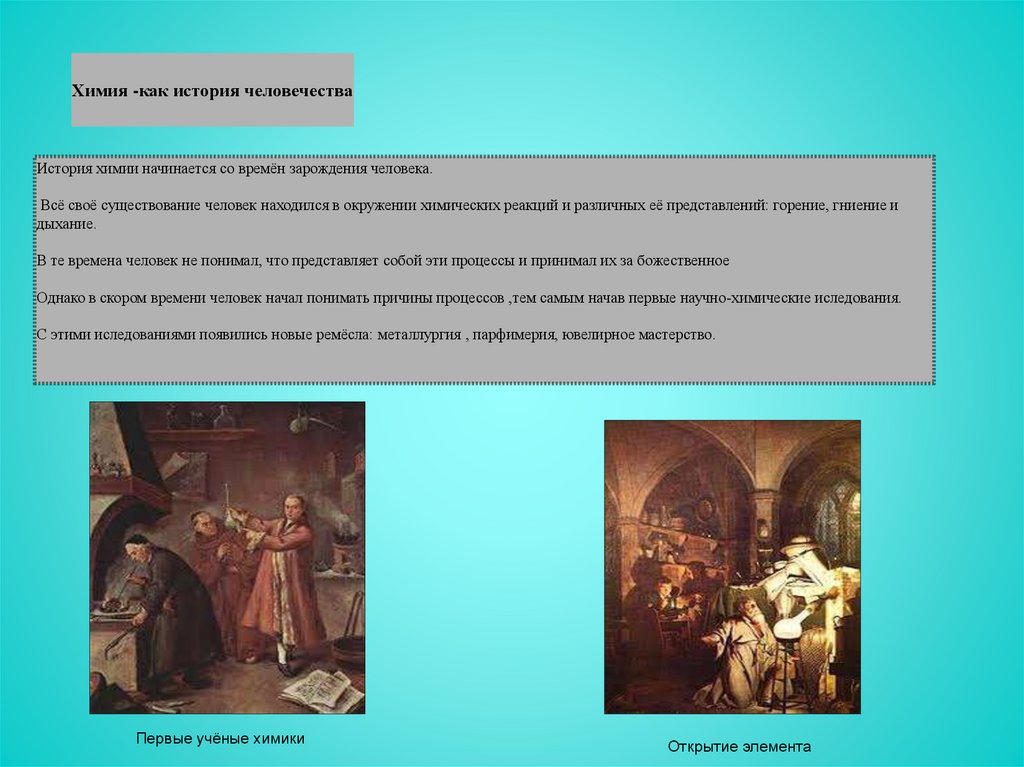 Химия -как история человечестваИстория химии начинается со времён зарождения человека.